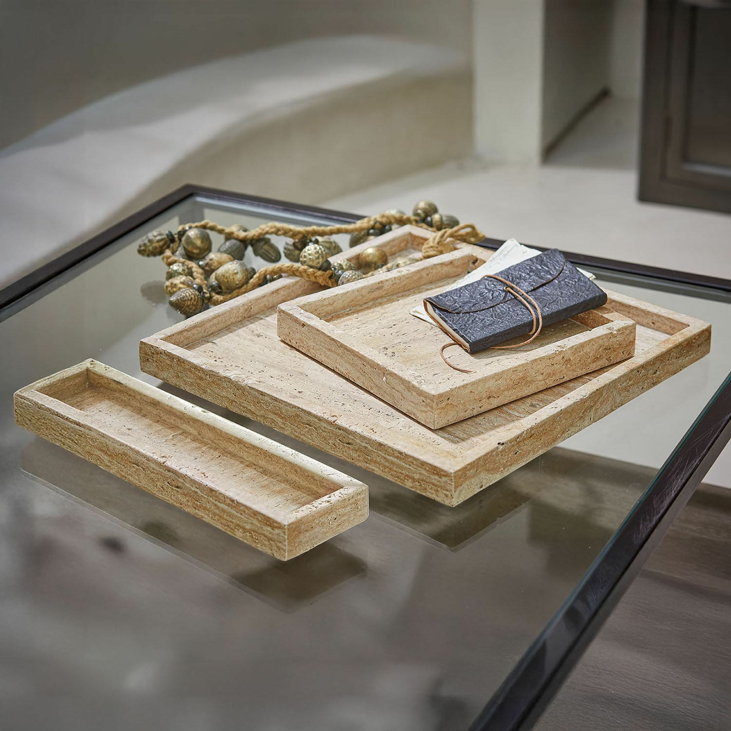 Diese Tabletts erzählen von Jahrtausenden – vom Werden, Schichten und Versteinern. Aus echtem Travertin gefertigt, wirkt jedes der drei Tabletts wie ein kleiner Ausschnitt aus einer natürlichen Gesteinsformation. Ihre schlichte rechteckige Form mit sanft abgeschrägten Kanten bringt Ruhe ins Arrangement und lässt Dekorationen, Gläser oder Duftkerzen besonders schön zur Geltung kommen. Die leicht porige Oberfläche und die warmen Erdtöne verleihen ihnen einen authentischen, handwerklich inspirierten Charakter. Ob als Ensemble oder einzeln – diese Tabletts vereinen Funktion und Naturästhetik auf elegante Weise.